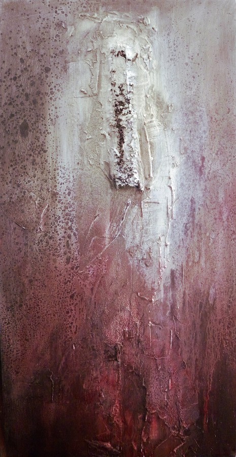 This work is second of two works on the subject. Their focus is the heavy build-up of the textural elements, which include found object and crack filler. The composition is simple, with a single strong, central foreground element in the upper portion of the work. It emerges from the visceral deep red background tonally and chromatically. The lack of a strong focal point lets the gaze meander over the surface, slowly uncovering the nature of the surface, inviting the viewer to get to know the surface until that is all that remains. The work attempts to recreate and reinterpret the tension that arises in the mind of a person suffering from an eating disorder, where the skin, theoretically at least, is meant to be a smooth homogenous surface but is, instead, can only be seen by the sufferer as an unpleasant, textured, marked and unhealthy prison.