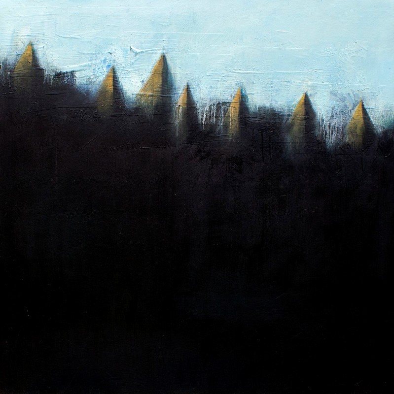 The Mountains of Madness, a mixed media and oil paint work on canvas-board, was originally the right panel of a diptych but now stands alone. It consists of a large, dominant, and uniformly painted area, separated from a sky-blue band at the top of the painting by a row of stylized pyramidal shapes. Some collaged elements are included.